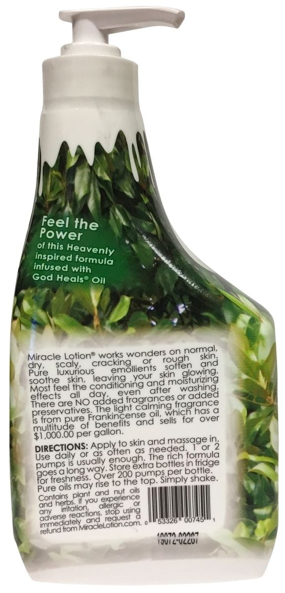 Keep your skin soft as a babys. Miracle Oil leaves a rich elegant feel and does a super job of lubricating and moisturizing. Century Systems Quick Miracle Lotion with God Heals Oil 16 fl oz 237 ml DescriptionNon-Greasy yet lasts All DayFragranced with Frankincense17 Natural Oils and 14 HerbsPanthenol Aloe VitaminsNaturally PreservedSuper MoisturizingThe Dry Skin FriendHEAL.
